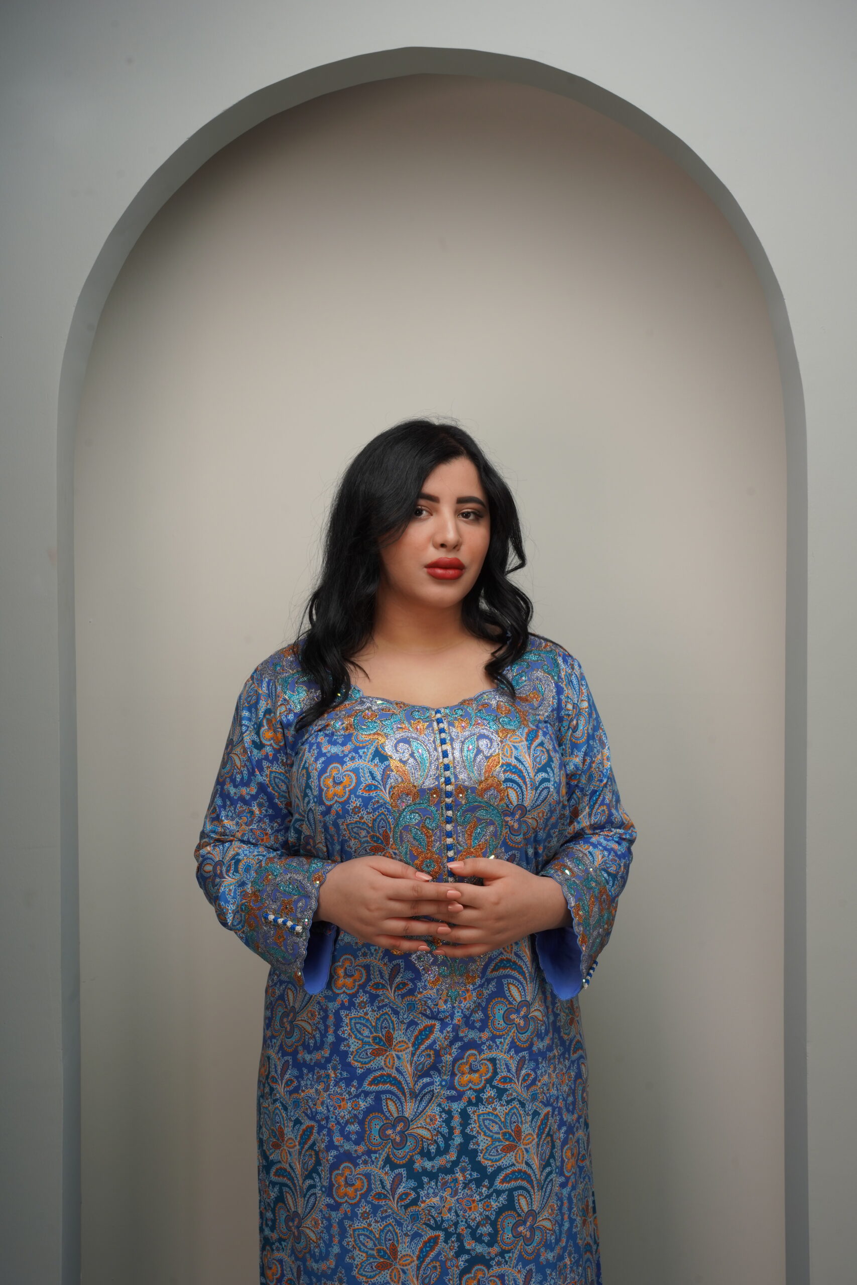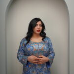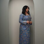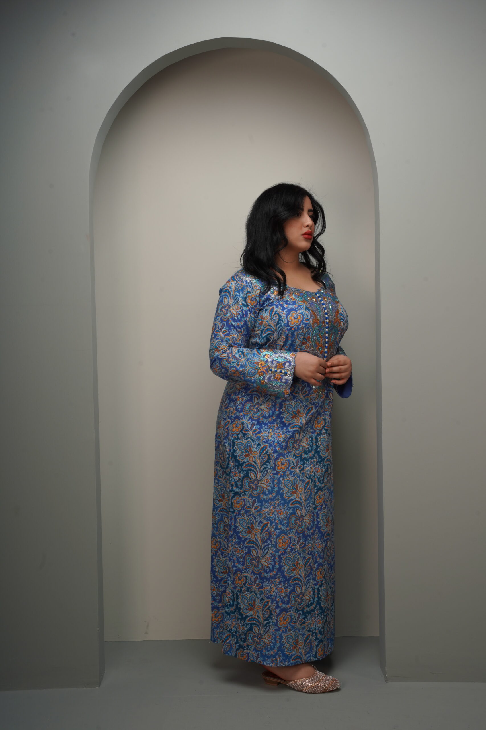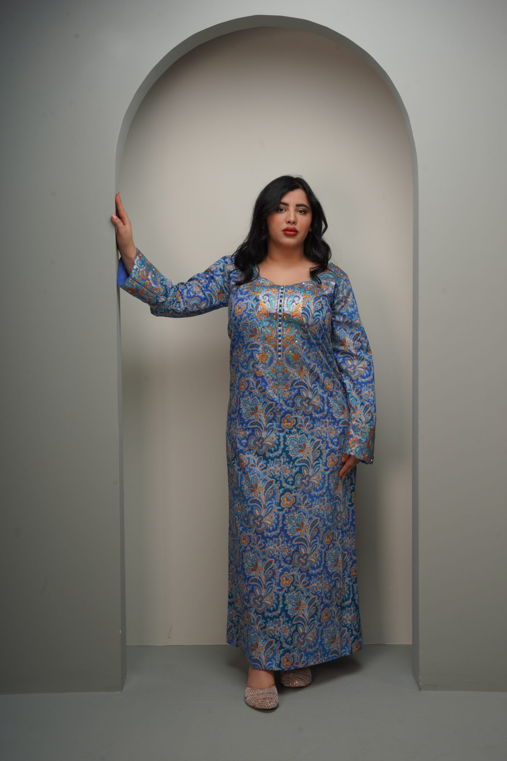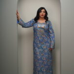 A traditional floor-length A-line silhouette with a modest, fluid drape, featuring long set-in sleeves finished with structured embroidered cuffs. The rounded neckline is highlighted by a central V-shaped embroidered chest panel that serves as the focal point of the design. Rendered either in a shimmering champagne-toned jacquard silk or a printed cotton-crepe with intricate blue and orange motifs, the surface is elevated with dense metallic embroidery accented by hand-stitched crystals and sequins. Styled with a soft chiffon shawl, the look balances heritage craftsmanship with refined versatility—suited for festive occasions or elegant everyday wear.