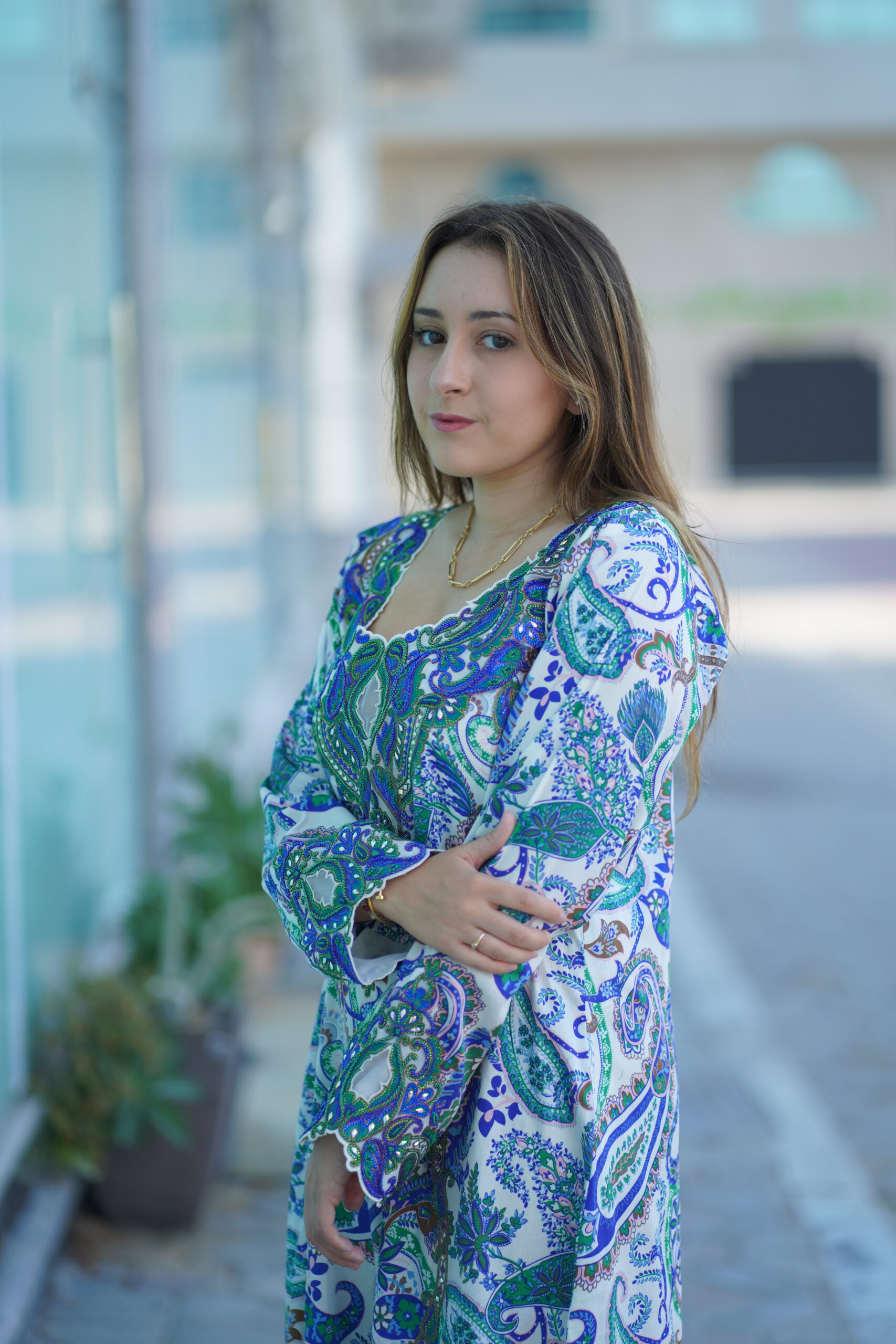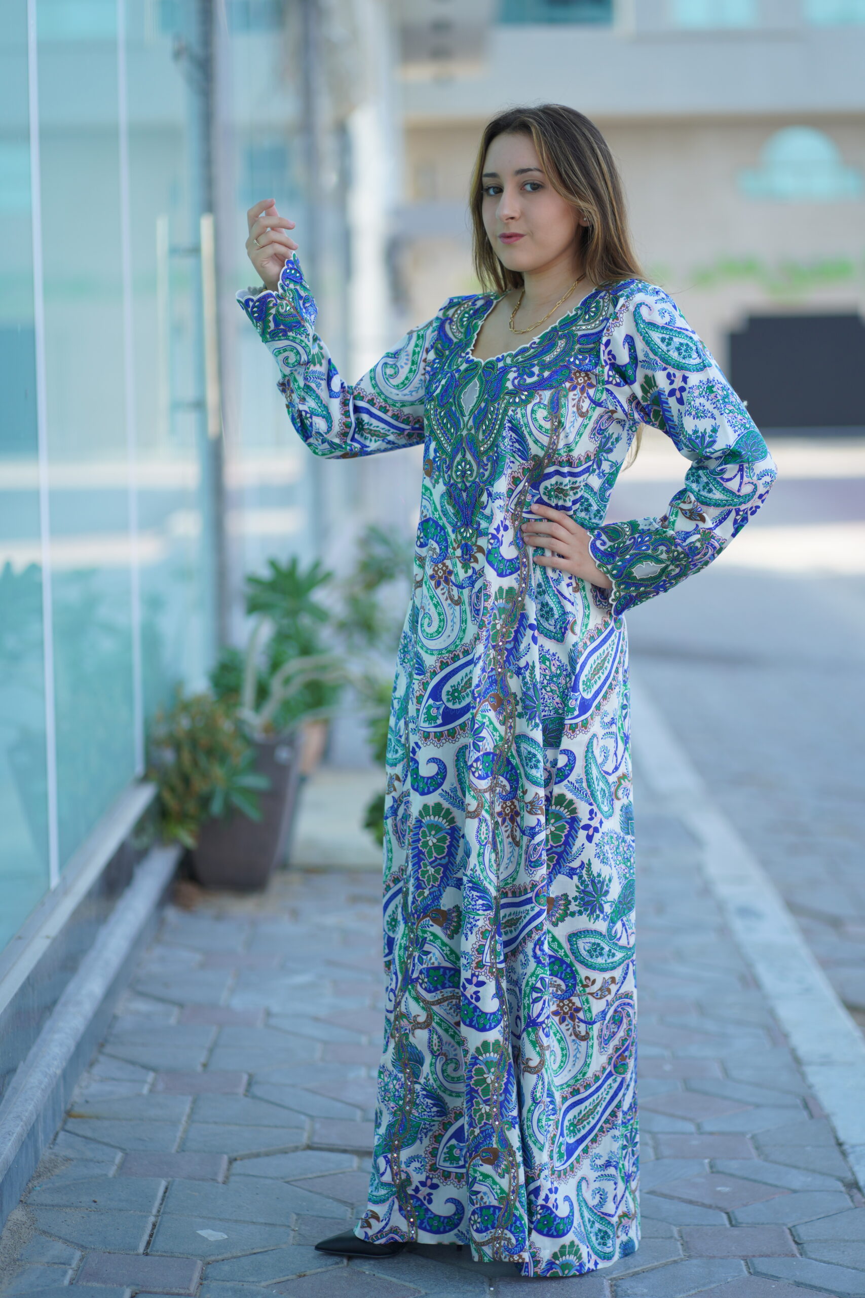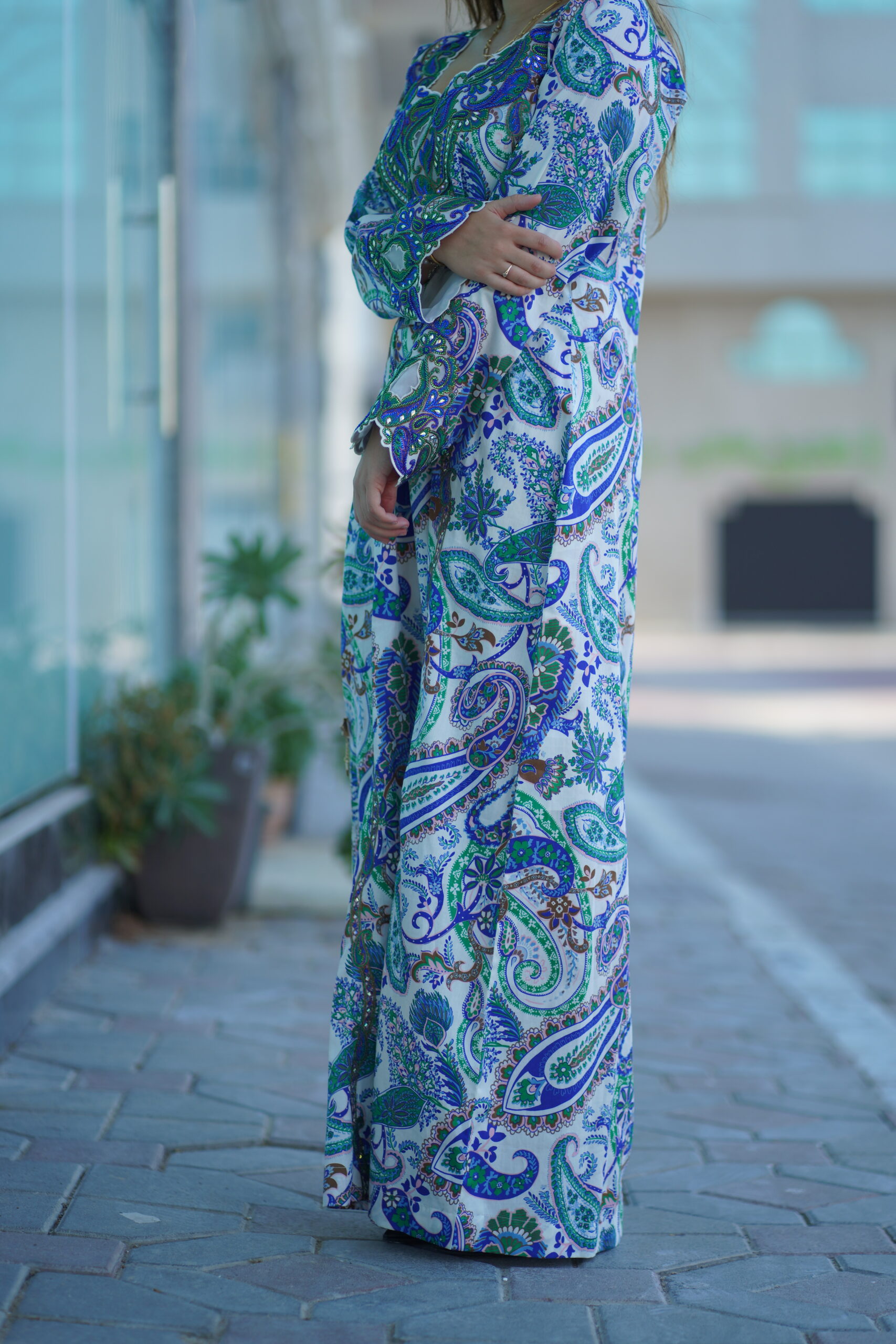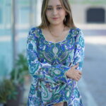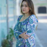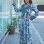 A graceful expression of traditional elegance, this flowing silhouette is adorned with intricate paisley-inspired floral motifs in soothing shades of blue, green, and white. The detailed all-over print brings a timeless charm, while the elegant cut ensures comfort and effortless sophistication. Perfect for everyday elegance, casual gatherings, or refined daytime wear.