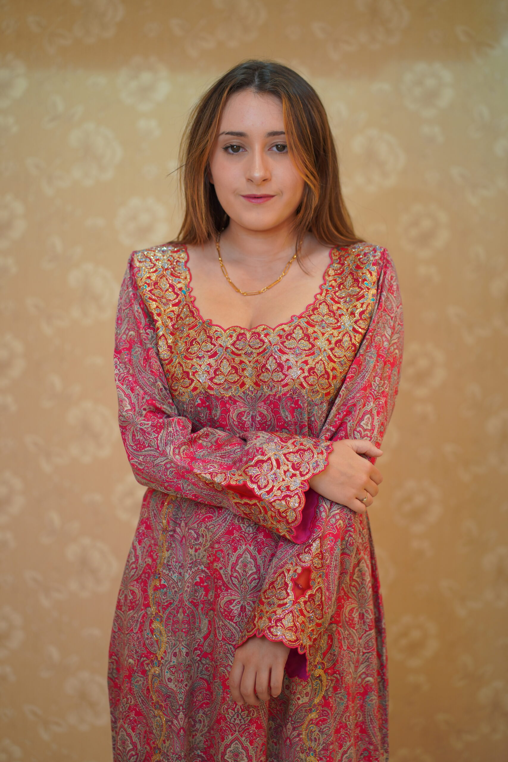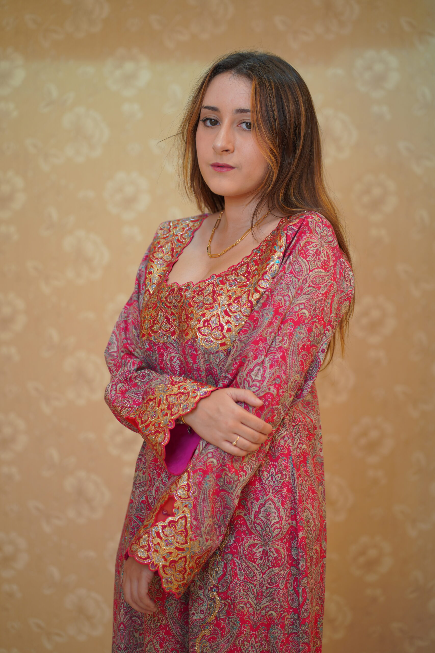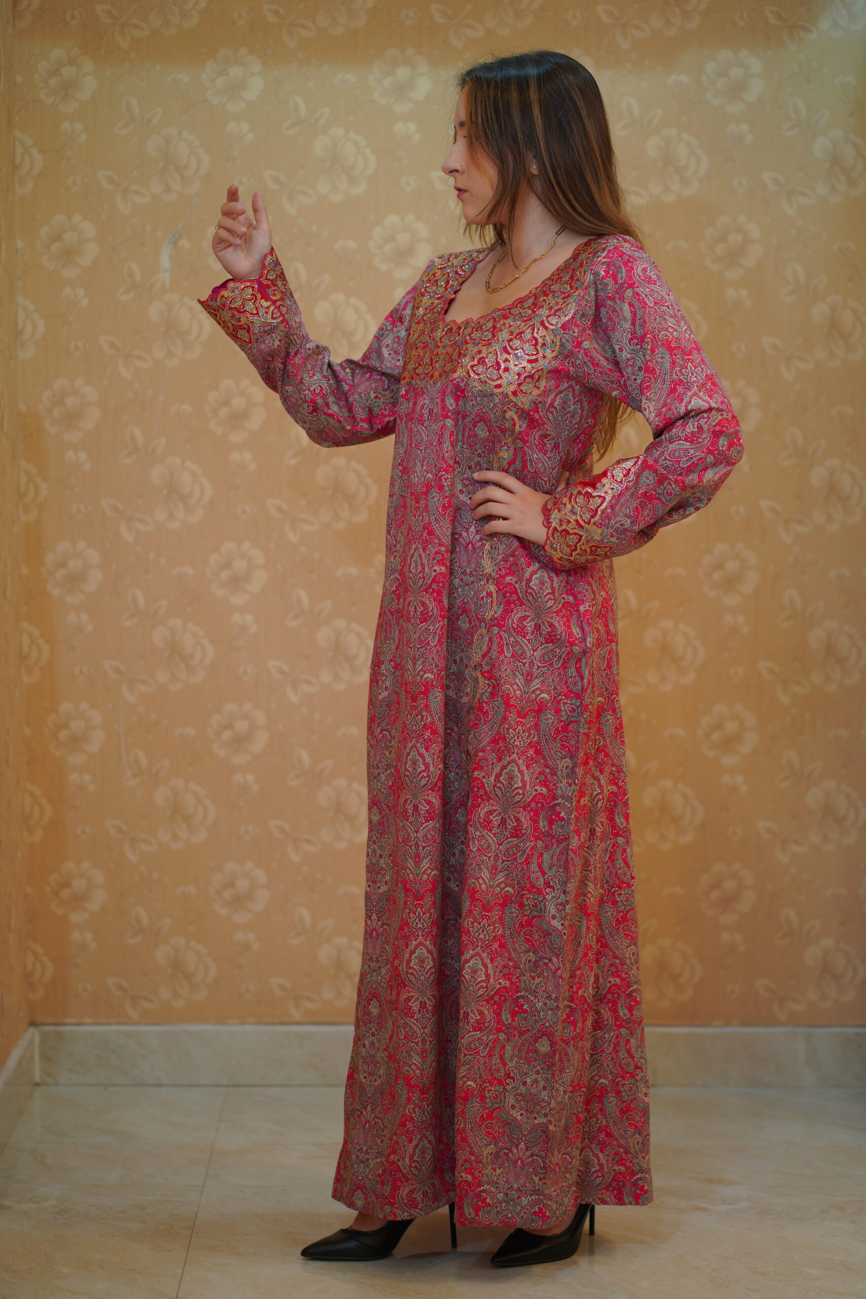 A celebration of traditional elegance, this Saudi-style Gulf jalabiya features a rich pink base adorned with intricate all-over floral and paisley patterns. The neckline is beautifully highlighted with delicate golden embroidery, adding a subtle touch of luxury. Long sleeves with detailed embroidered cuffs enhance the graceful silhouette, while the flowing cut ensures comfort and effortless sophistication. Perfect for festive gatherings, cultural occasions, or elegant evenings, this jalabiya blends timeless heritage with refined femininity.