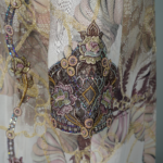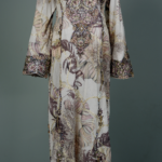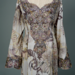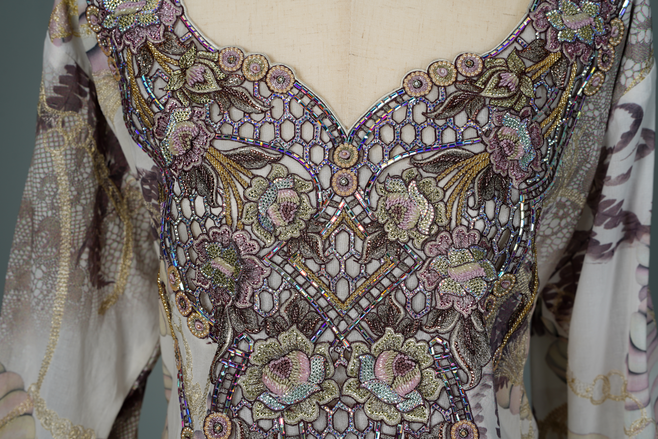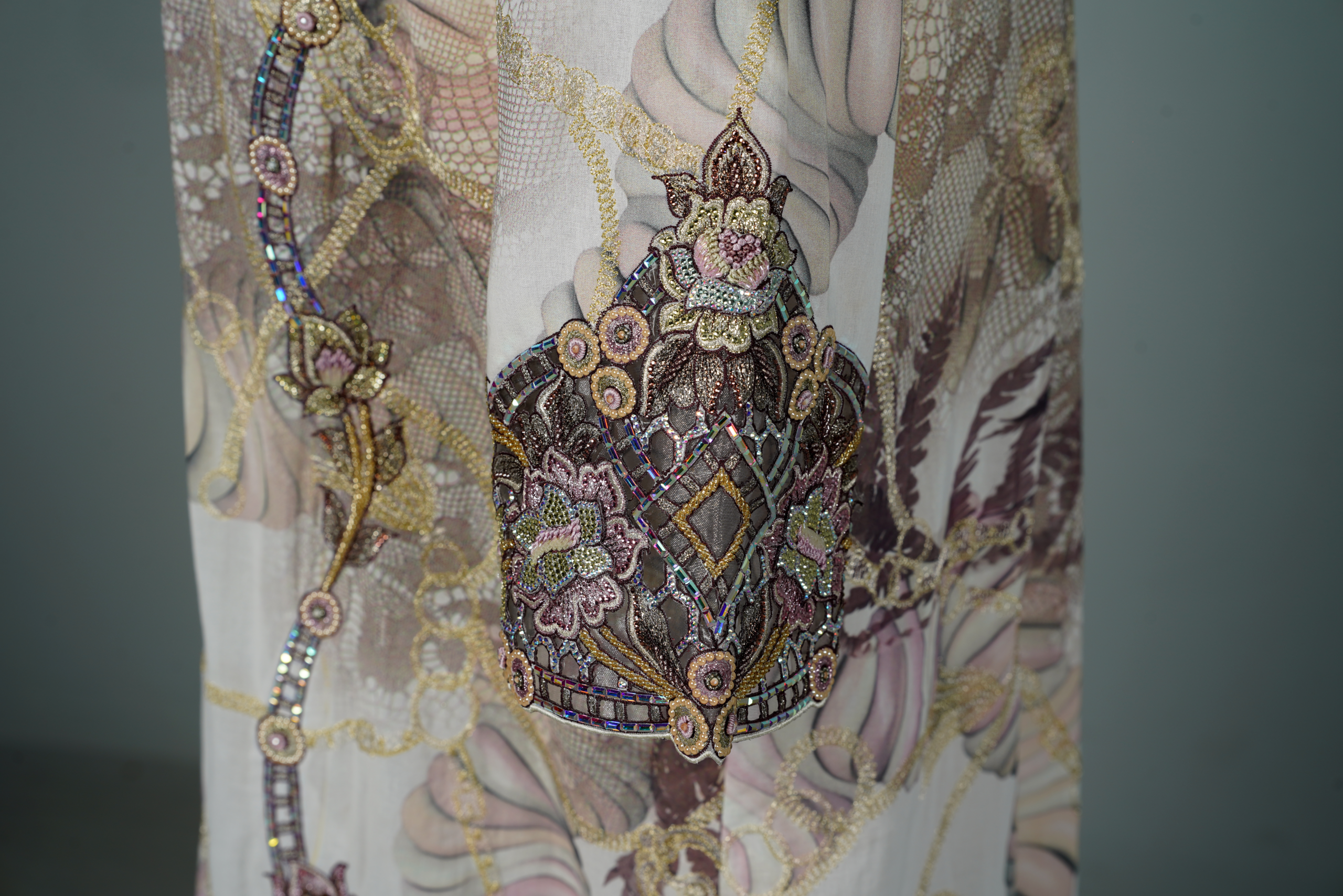 Exuding timeless elegance, this kaftan features a beaded neckline and cuffs with intricate detailing that evokes a built-in statement necklace, inspired by Dubai-style and Moroccan couture. A muted, earthy floral print graces flowing silk, crepe, or premium georgette, lending a refined botanical or Mughal-inspired charm. The bodice is enriched with 3D floral appliqués, sequins, and metallic Zardosi embroidery, adding depth and couture texture. Its floor-length, gracefully structured silhouette with long sleeves ensures a sophisticated, modest, and effortlessly regal presence.