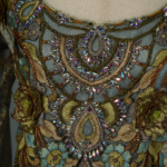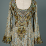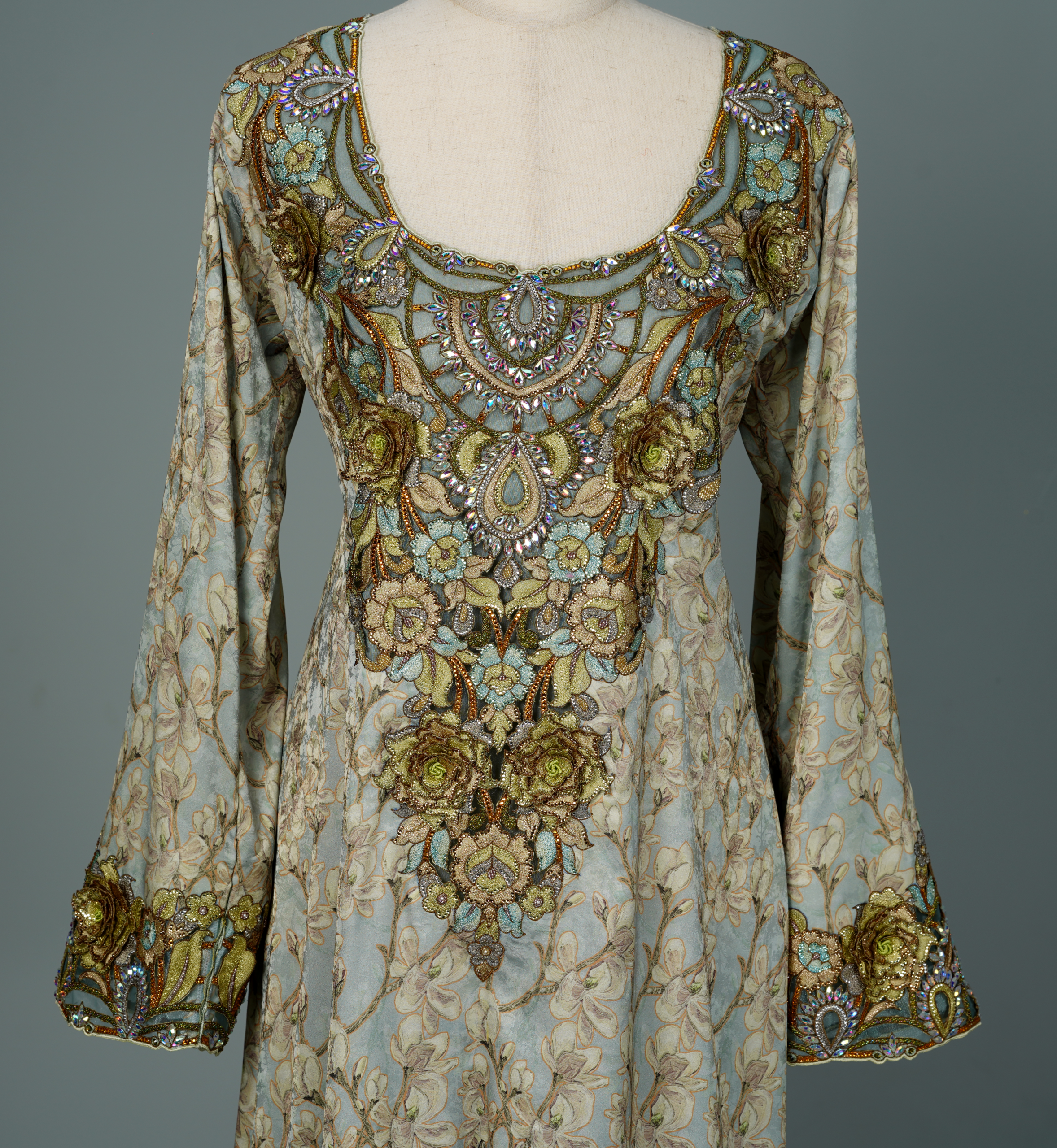 This classic A-line, floor-length gown features long, flared bell sleeves for a graceful, flowing silhouette. The deep scoop neckline is adorned with intricate embroidery and beadwork, resembling a statement necklace. The bodice and cuffs are richly embellished with 3D floral appliqués, sequins, and metallic threadwork, showcasing exquisite Zardosi or Maghrebi craftsmanship. A delicate, all-over botanical print, reminiscent of magnolias, enhances the luxurious silk or high-quality crepe fabric, completing the refined and timeless design.