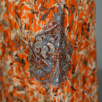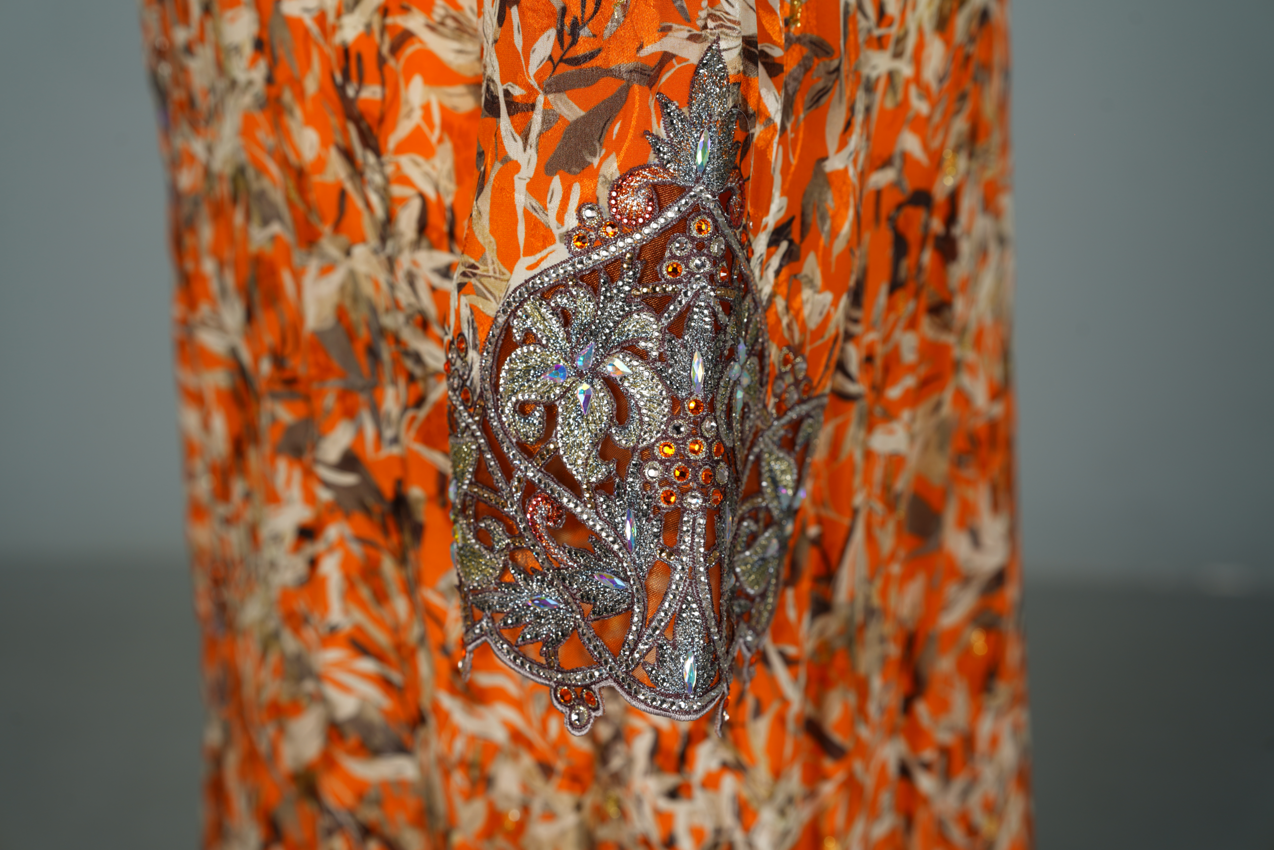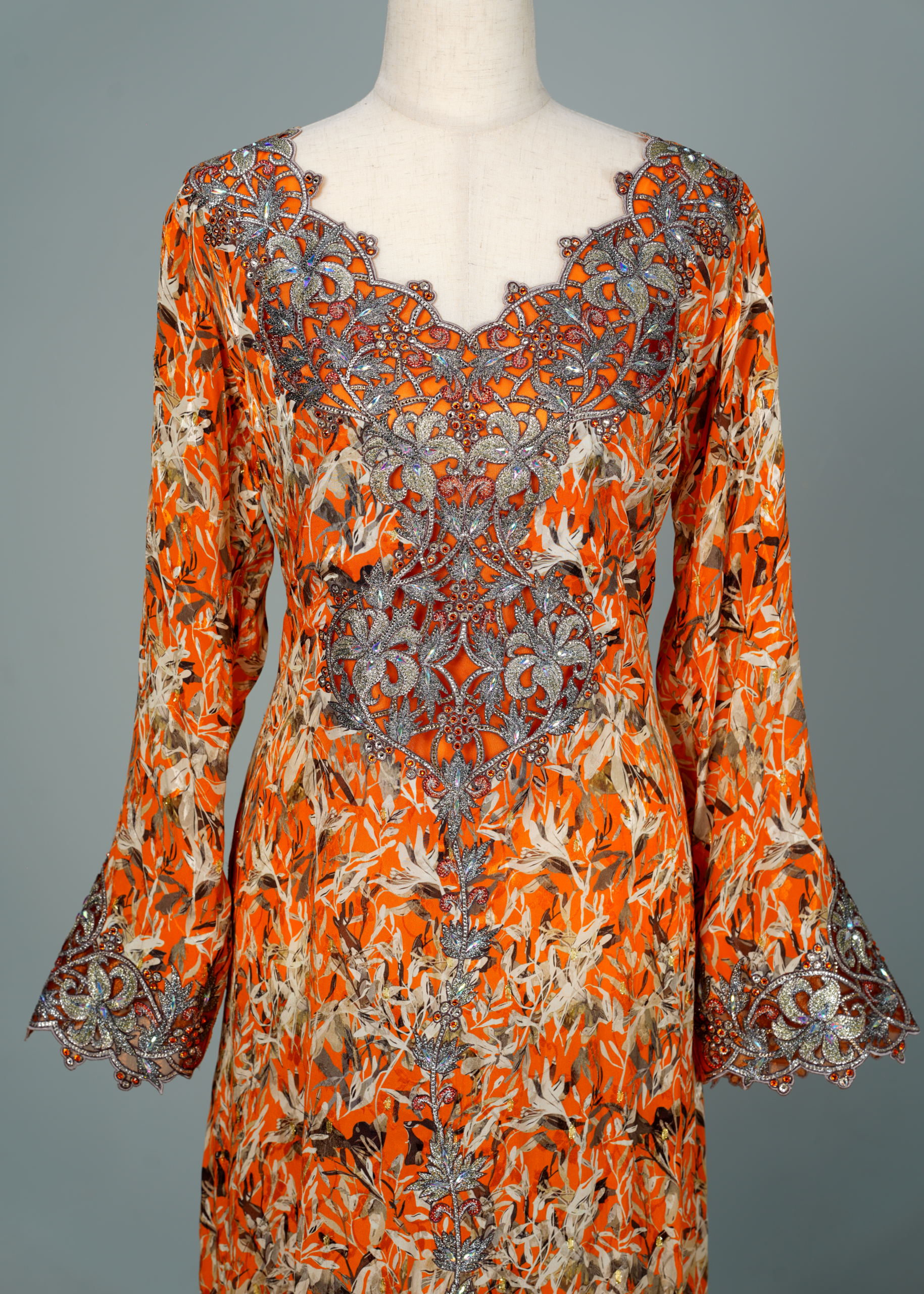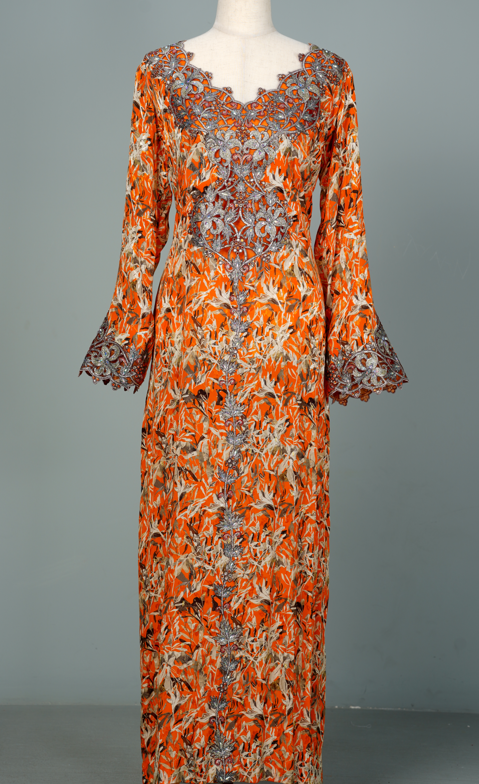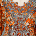 These exquisite garments feature heavily embellished necklines with beadwork, sequins, and metallic Zardosi threadwork, often resembling a built-in statement necklace. The bodice and cuffs are adorned with 3D floral appliqués and intricate hand embroidery, adding depth and couture texture. Floor-length A-line and Farasha (butterfly) silhouettes are paired with long, flowing bell or angel sleeves, creating a graceful, regal presence. The fabrics are elevated with muted botanical or floral prints on luxurious materials such as silk, crepe, or georgette, perfectly blending artistry with elegance.