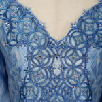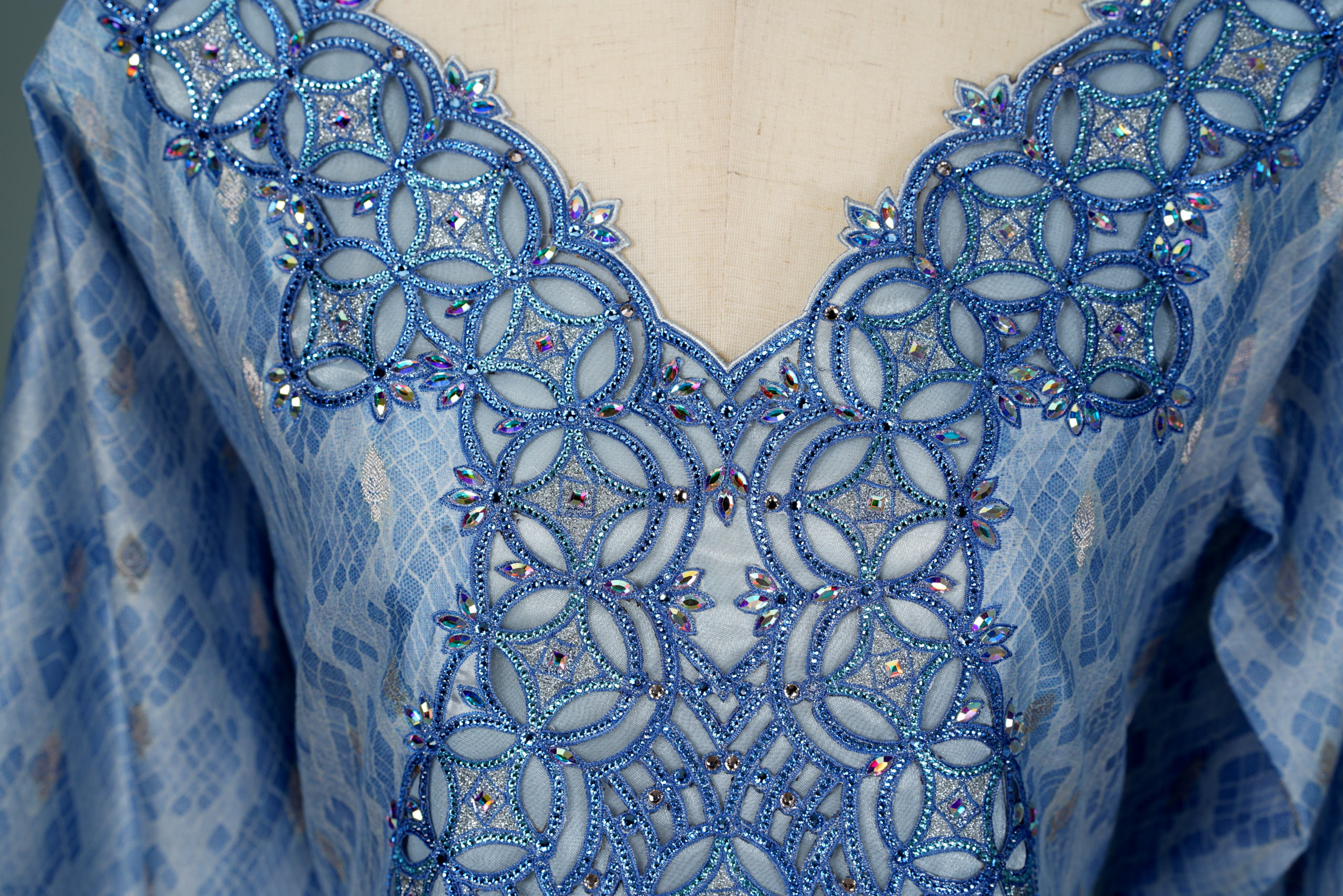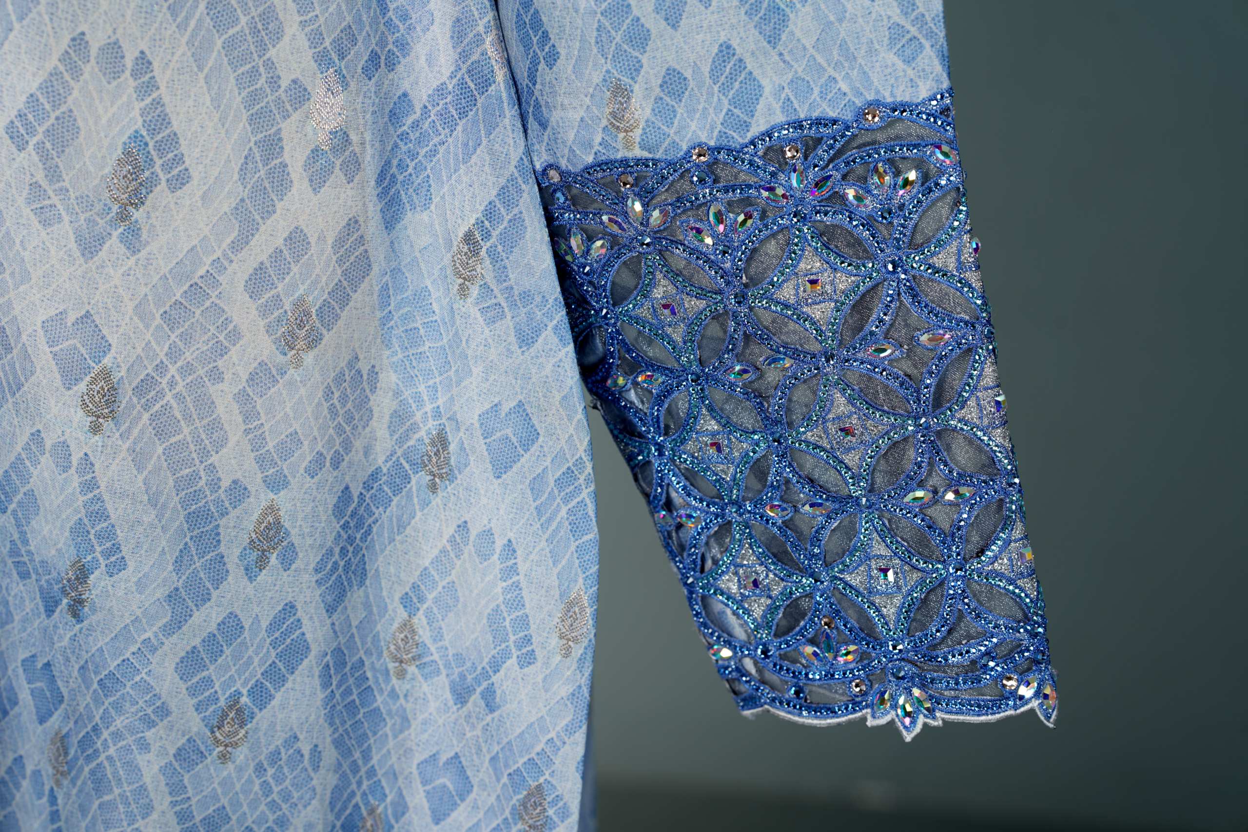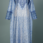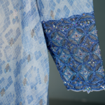 This elegant piece features a deep V-neckline adorned with intricate Zardozi or Aari embroidery, where interlocking circular motifs are accented with crystals and sequins for a textured, sparkling effect. The body is crafted from light blue jacquard with a geometric diamond or ikat-style weave, offering a subtle sheen that hints at silk or a silk-blend fabric. Long, slightly flared sleeves echo the neckline’s embroidery at the cuffs, creating a harmonious, cohesive design. A structured A-line silhouette ensures a formal, graceful look while maintaining modesty and comfort.