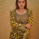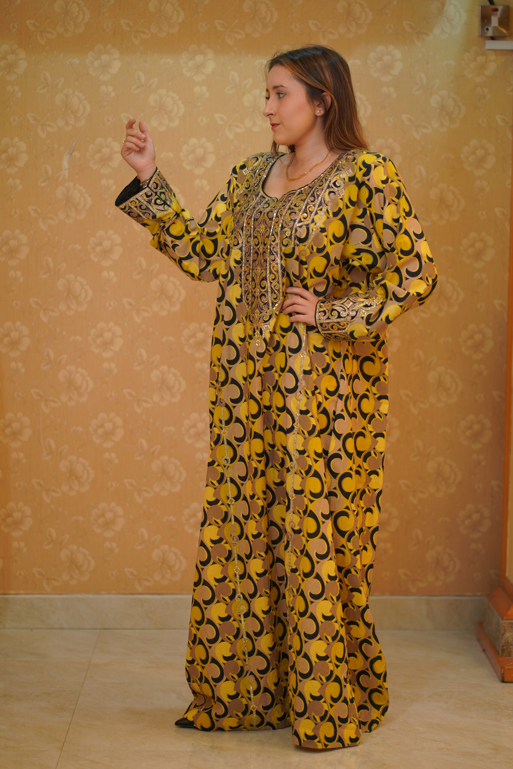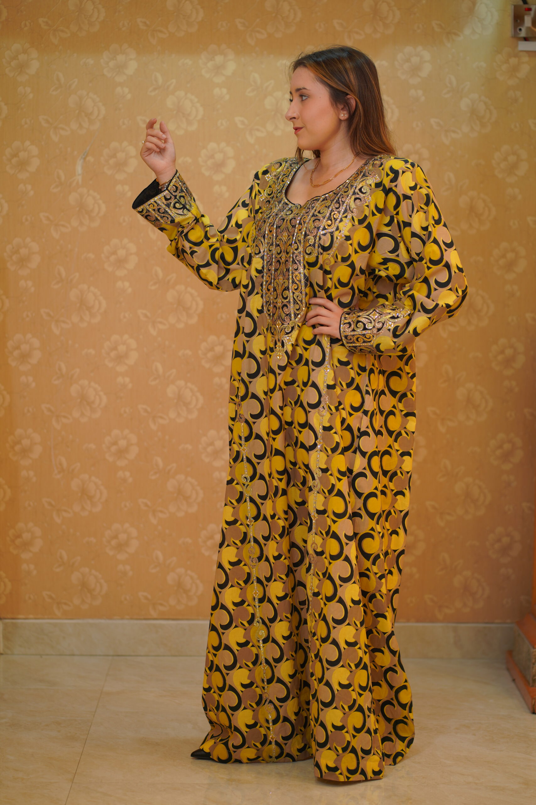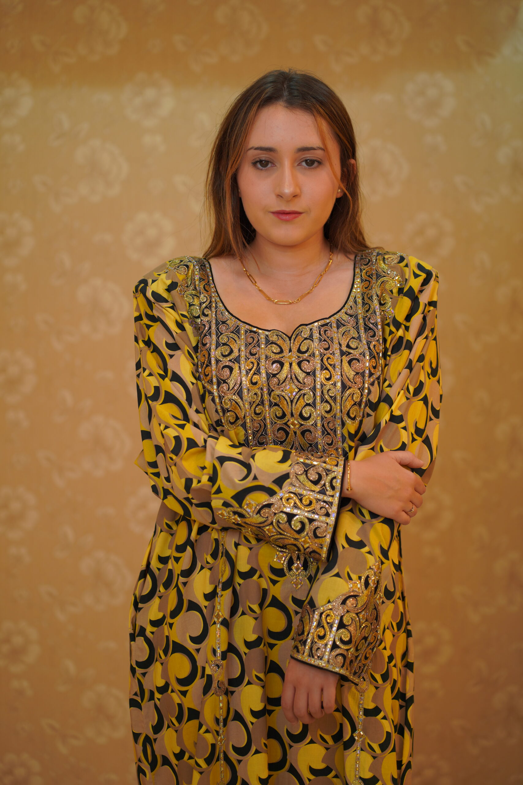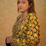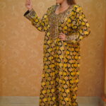 This Pheran features a warm mustard yellow base enriched with flowing golden tones and bold black motifs for striking contrast. Traditional bronze-gold Tilla embroidery adorns the neckline and sleeves, accented with tan and caramel hues, while silver and champagne sequins add a subtle, graceful shimmer for a regal, handcrafted finish.