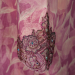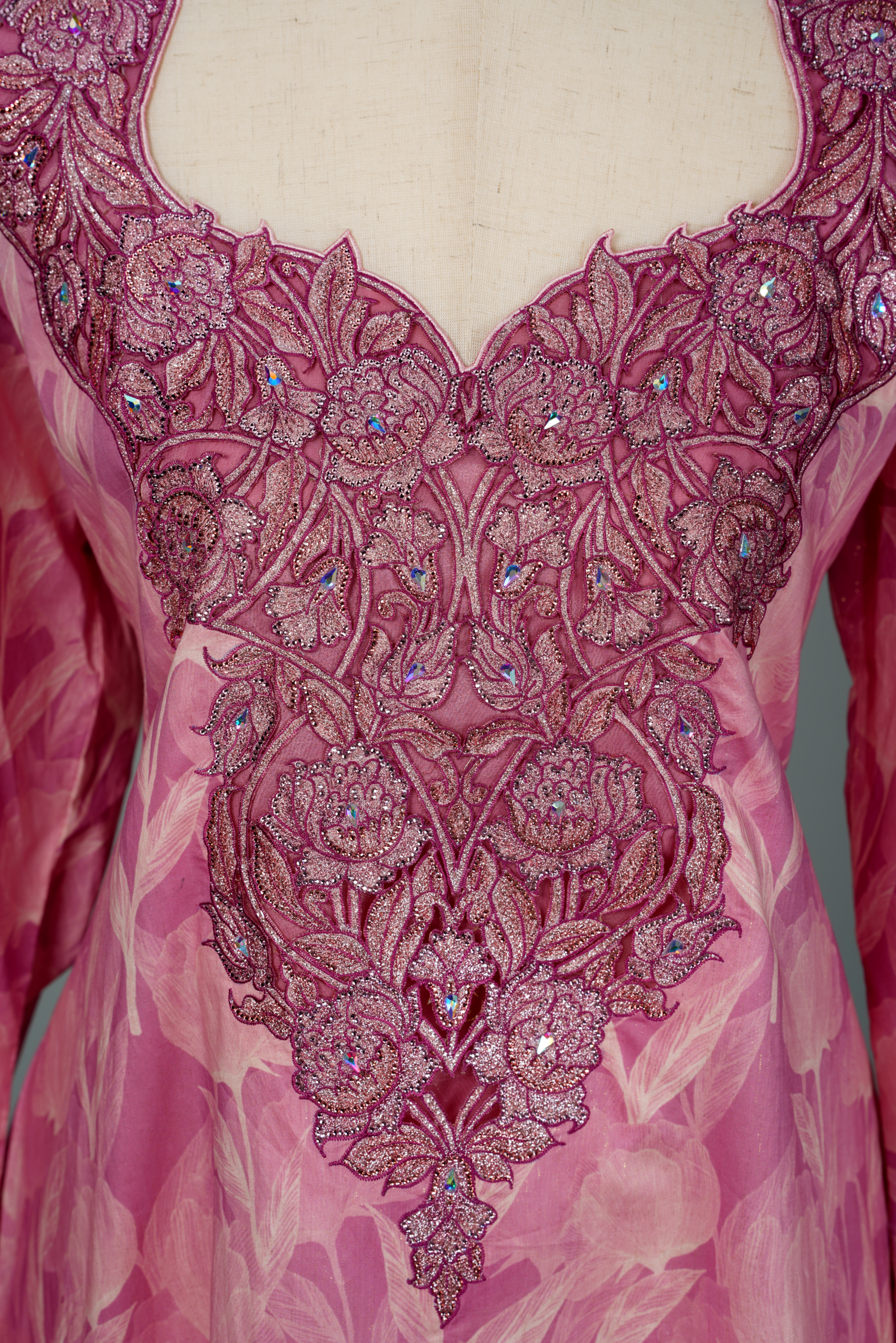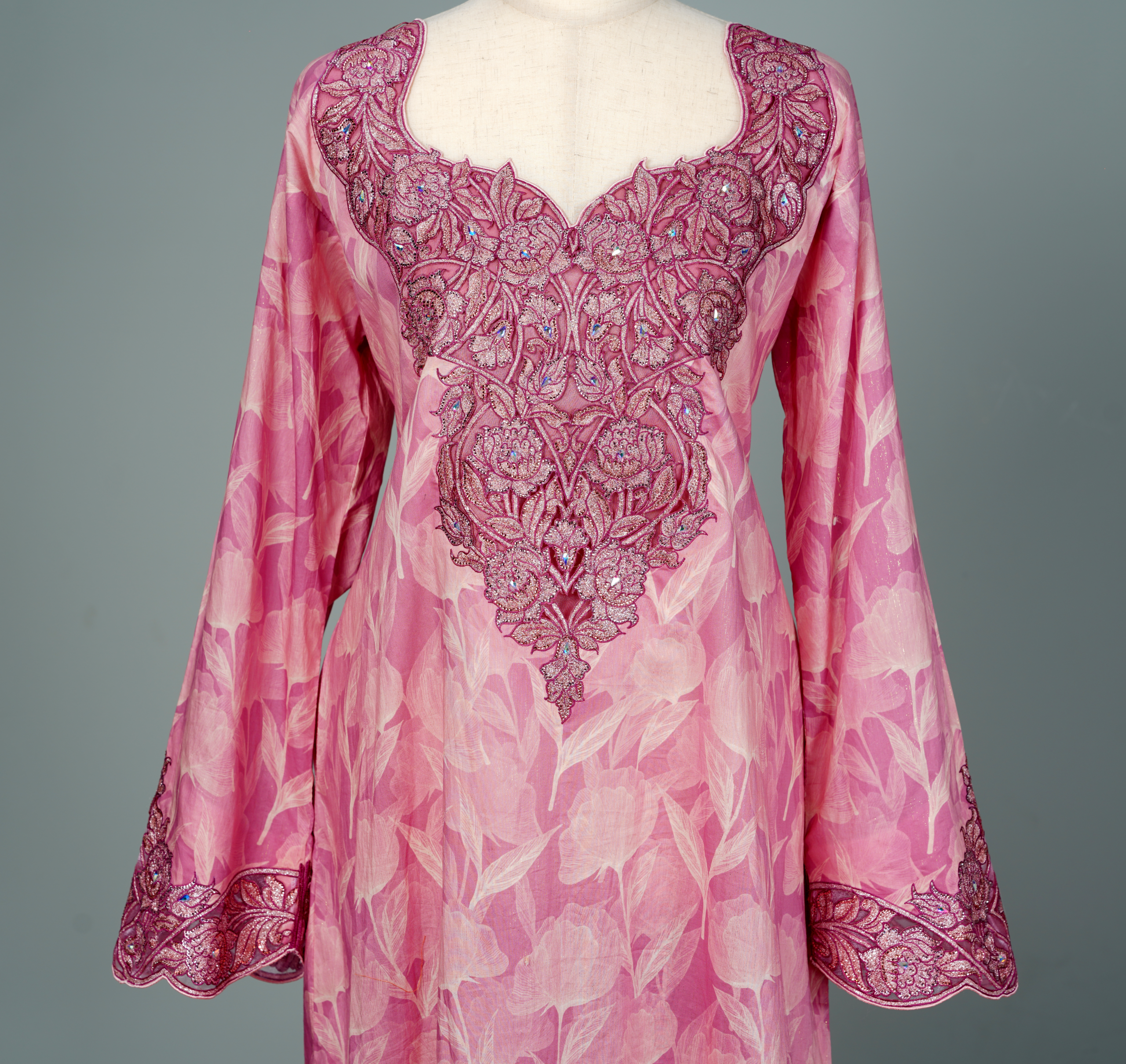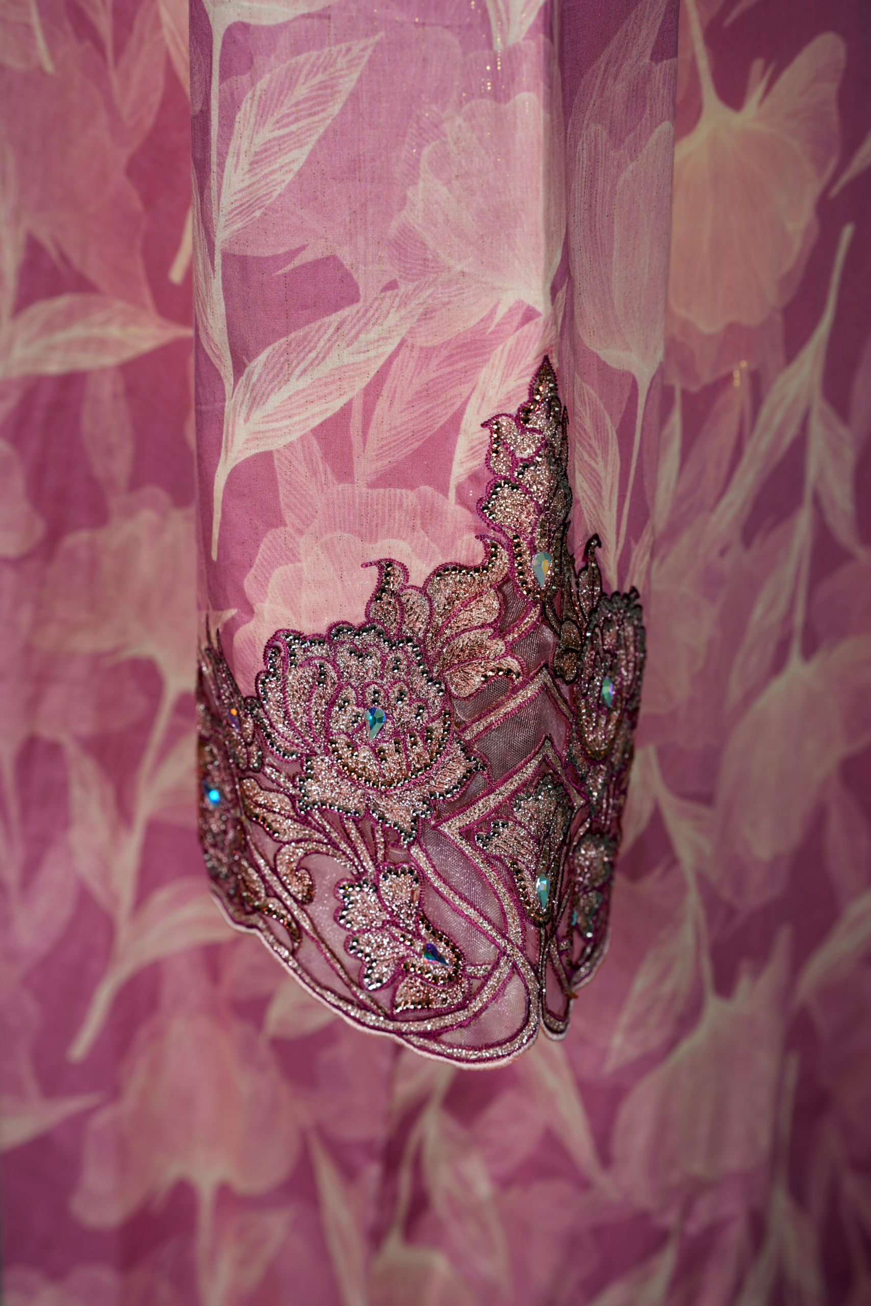 This stunning piece is a modern take on a Kaftan or Jalabiya, featuring a vibrant pink floral print and exquisite embroidery. The sweetheart-style neckline is richly accented with Zardosi or detailed threadwork, while elegant bell sleeves mirror the embroidery onto the cuffs for a harmonious, luxurious look. Crafted from lightweight silk or premium crepe, the fabric showcases a soft, monochromatic floral overlay, creating a graceful and effortlessly sophisticated silhouette.