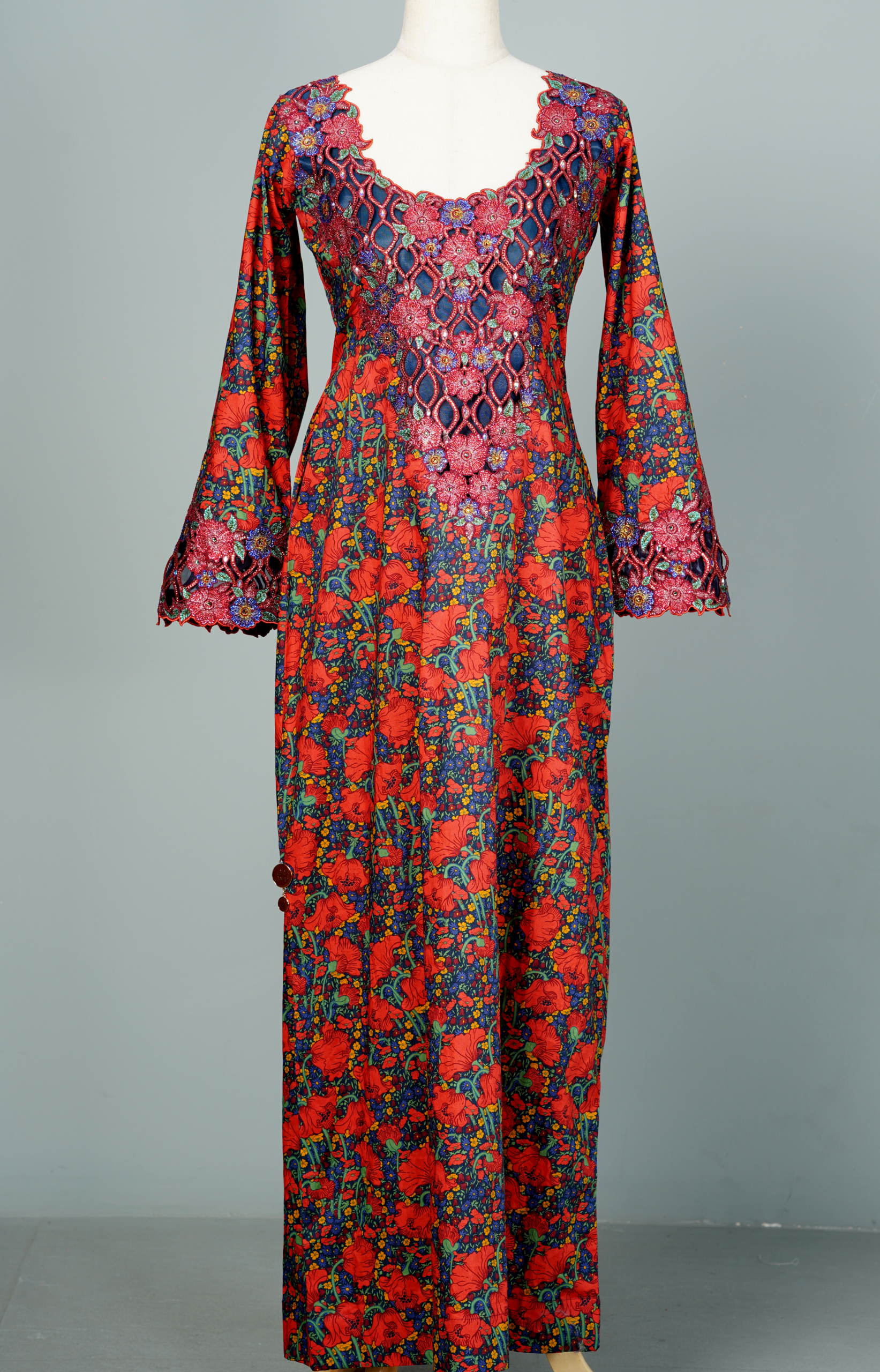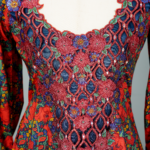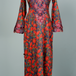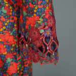This elegant kaftan in rich magenta and purple features a wide scalloped V-neckline adorned with intricate lattice-style embroidery, echoed on the bell-sleeve cuffs. Diagonal pink lines overlay a floral backdrop, creating a dynamic, structured print, while the relaxed maxi silhouette in lightweight fabric drapes gracefully for effortless sophistication.