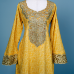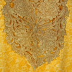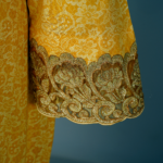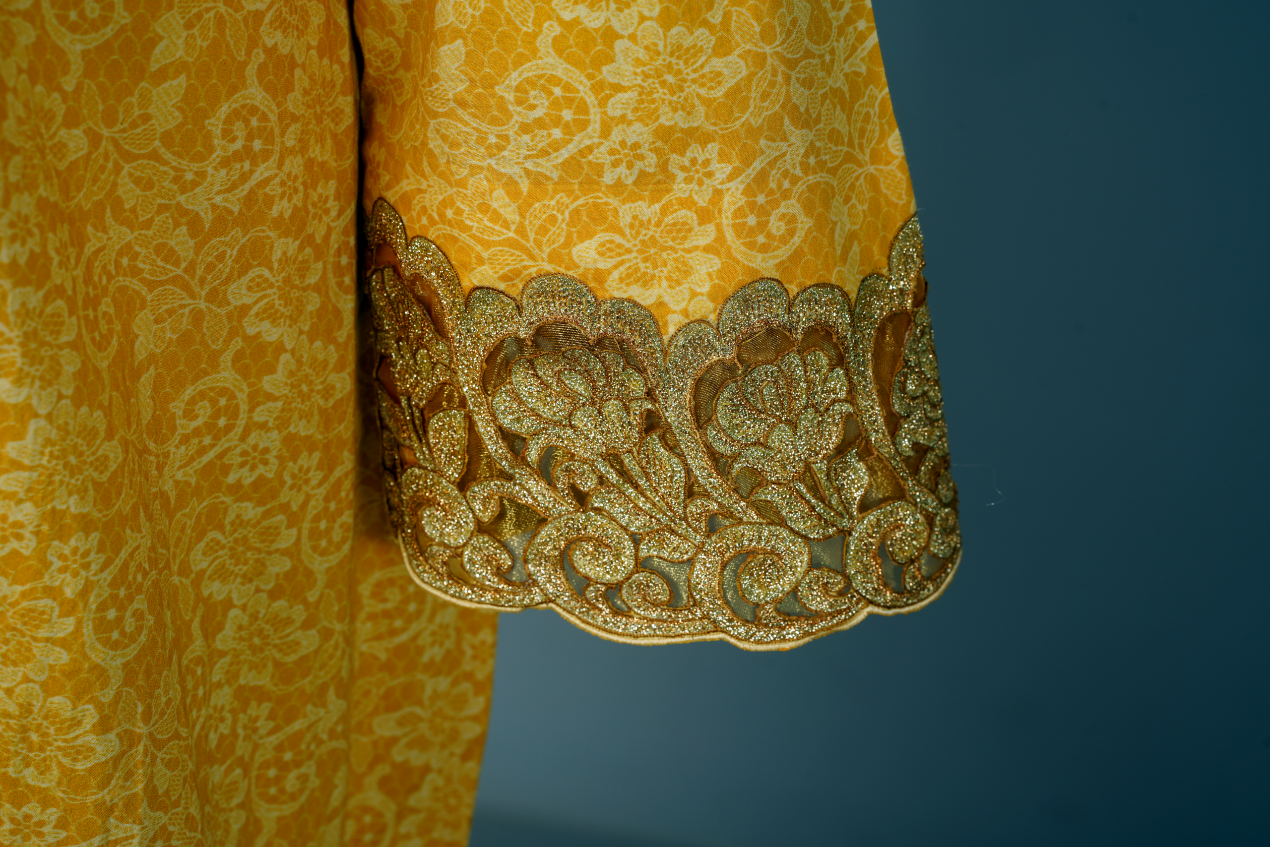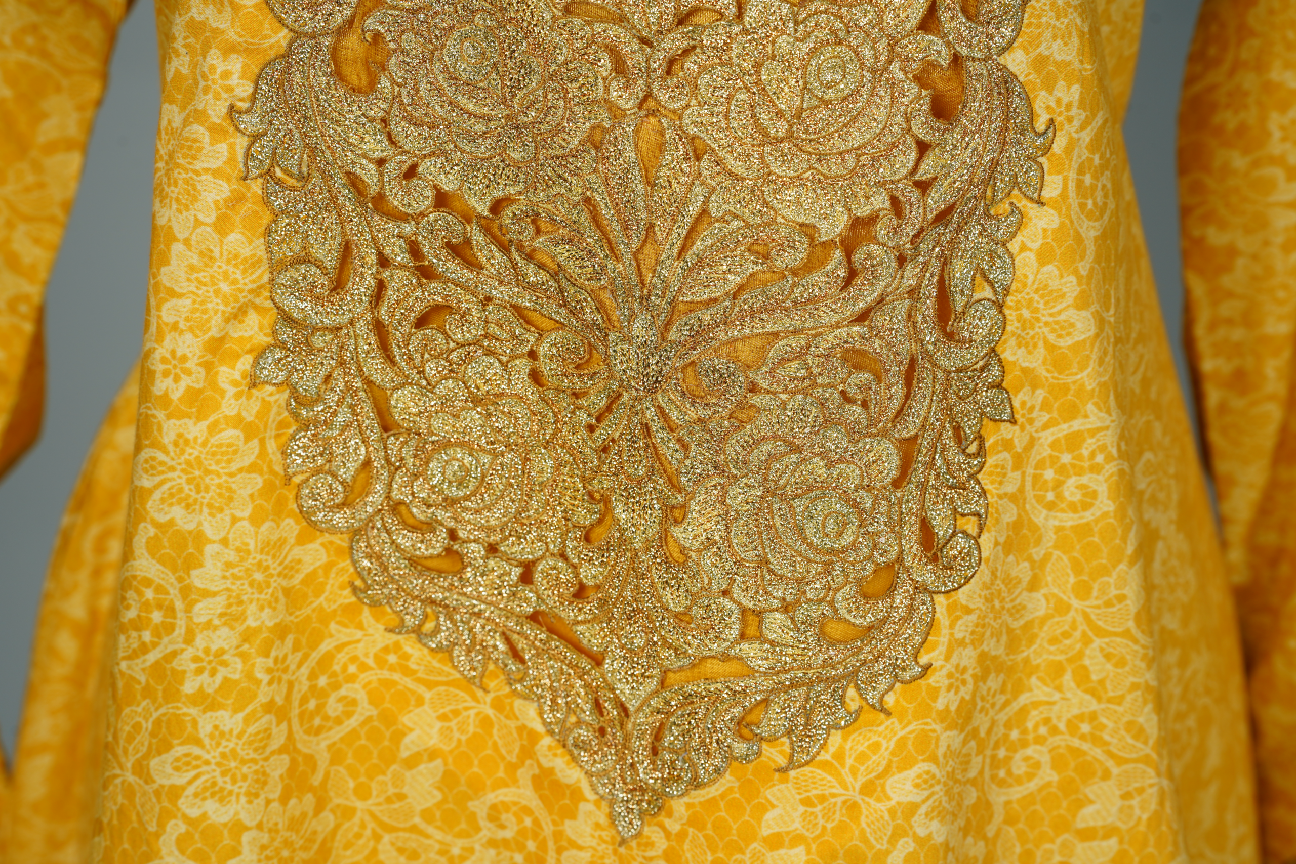The vibrant mustard yellow base paired with intricate metallic embroidery creates a richly festive, regal appeal. A subtle tone-on-tone damask floral print adds depth to the fabric, while the scalloped gold floral embroidery forms a striking bib-style neckline and is echoed on the wide bell-shaped cuffs. Finished with a relaxed A-line silhouette and flowing flared sleeves, this design reflects timeless elegance inspired by traditional ceremonial wear.