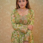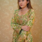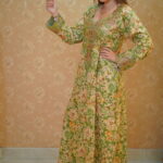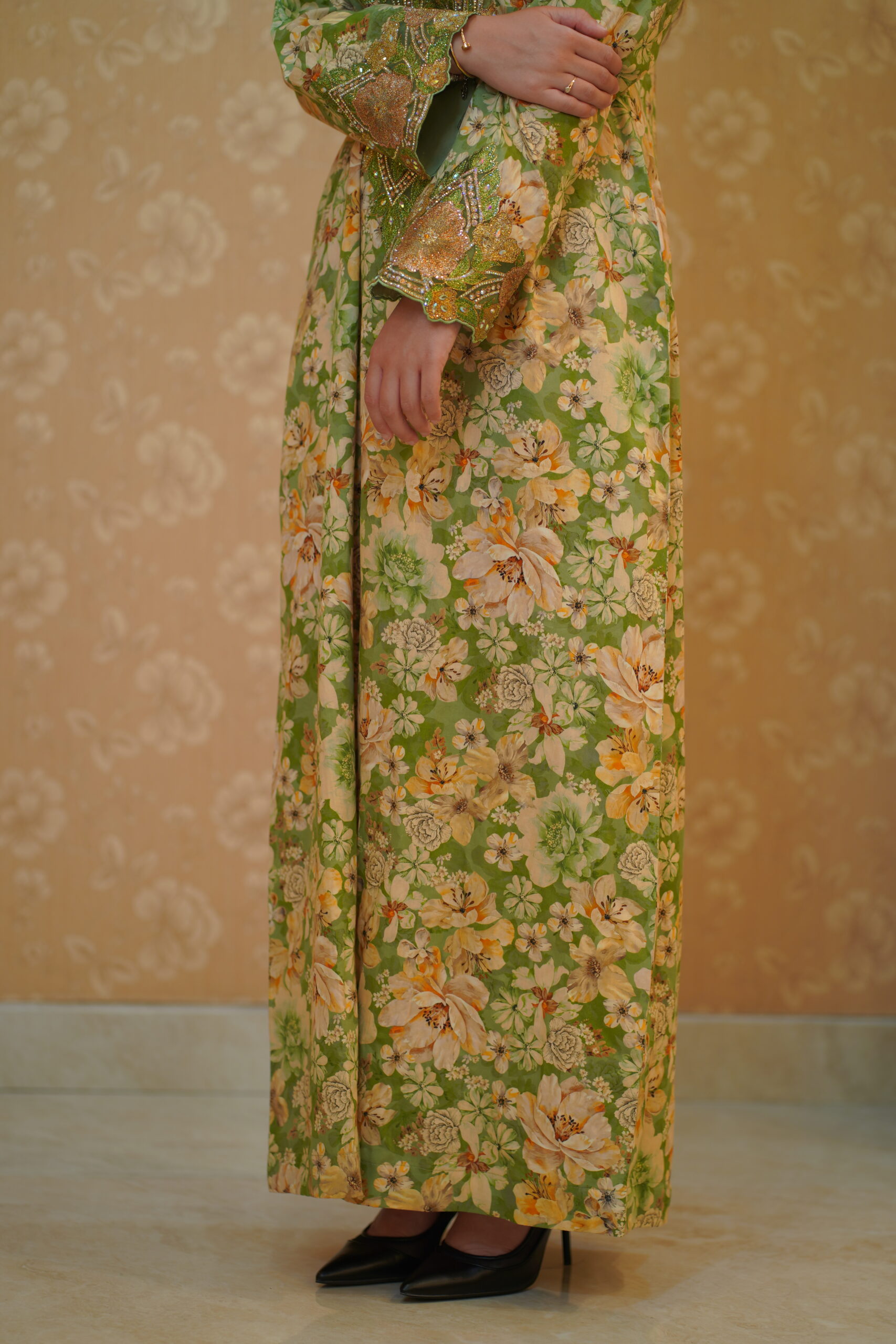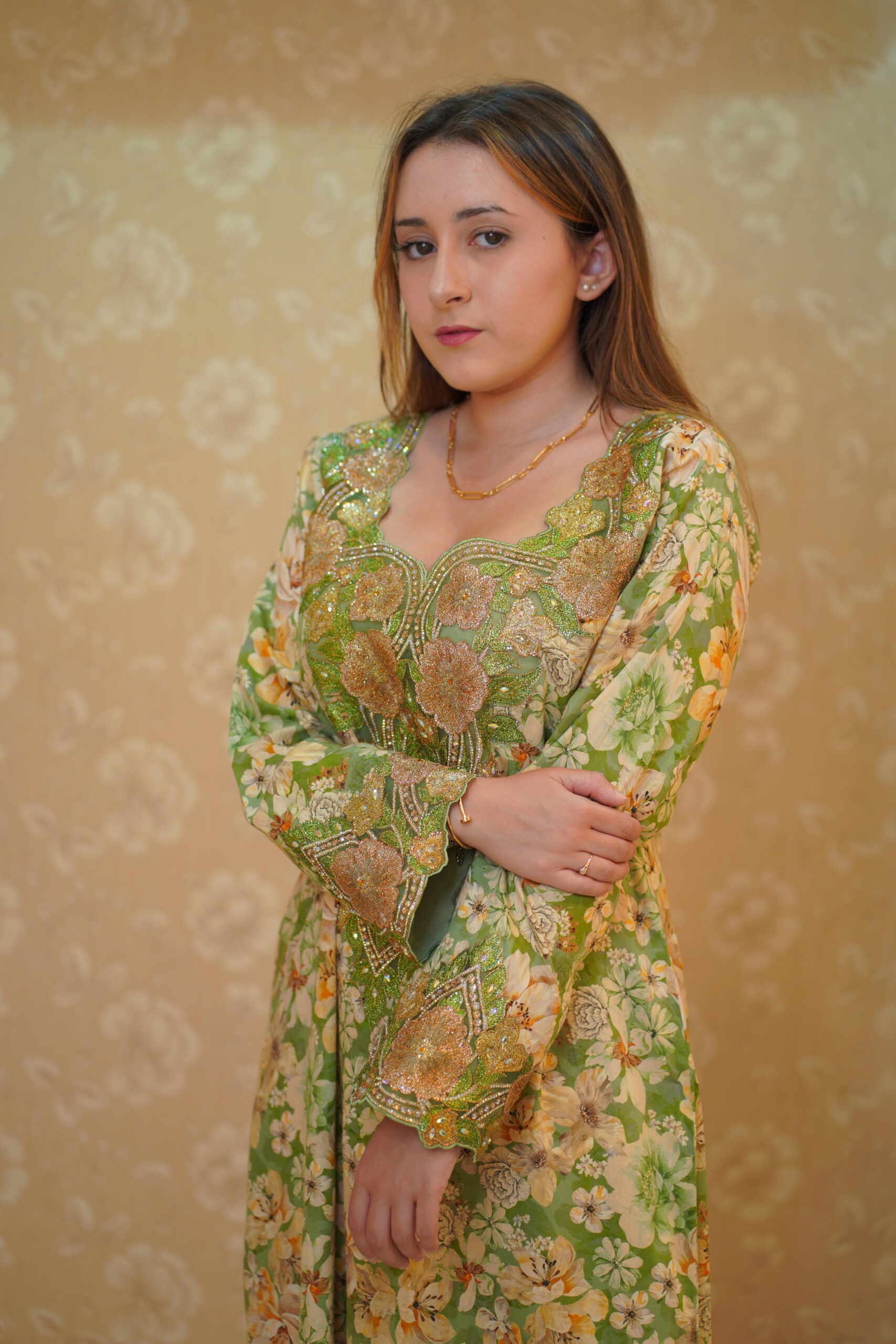 A classic A-line or straight-cut silhouette with a modest, fluid drape, featuring a rounded or softly V-shaped neckline that leads into a richly embellished chest panel. Long set-in sleeves end in structured embroidered cuffs that echo the central detailing, with select satin styles accented by a vertical pleated front panel for added texture. Available in refined champagne or ivory satin as well as vibrant floral and paisley prints, each piece is finished with intricate metallic embroidery and hand-applied crystals, sequins, and beads for a subtle, elegant shimmer.