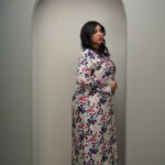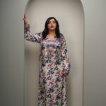 Crafted from a luxurious satin-silk blend, this Jalabiya drapes beautifully with a soft, elegant sheen. The V-shaped neckline is adorned with intricate beadwork and embroidery, creating a festive focal point perfect for weddings, Ramadan, or Eid. A colorful floral motif on a cream background adds versatility for both day and evening events, while the straight, relaxed silhouette with long sleeves ensures comfort and timeless elegance.